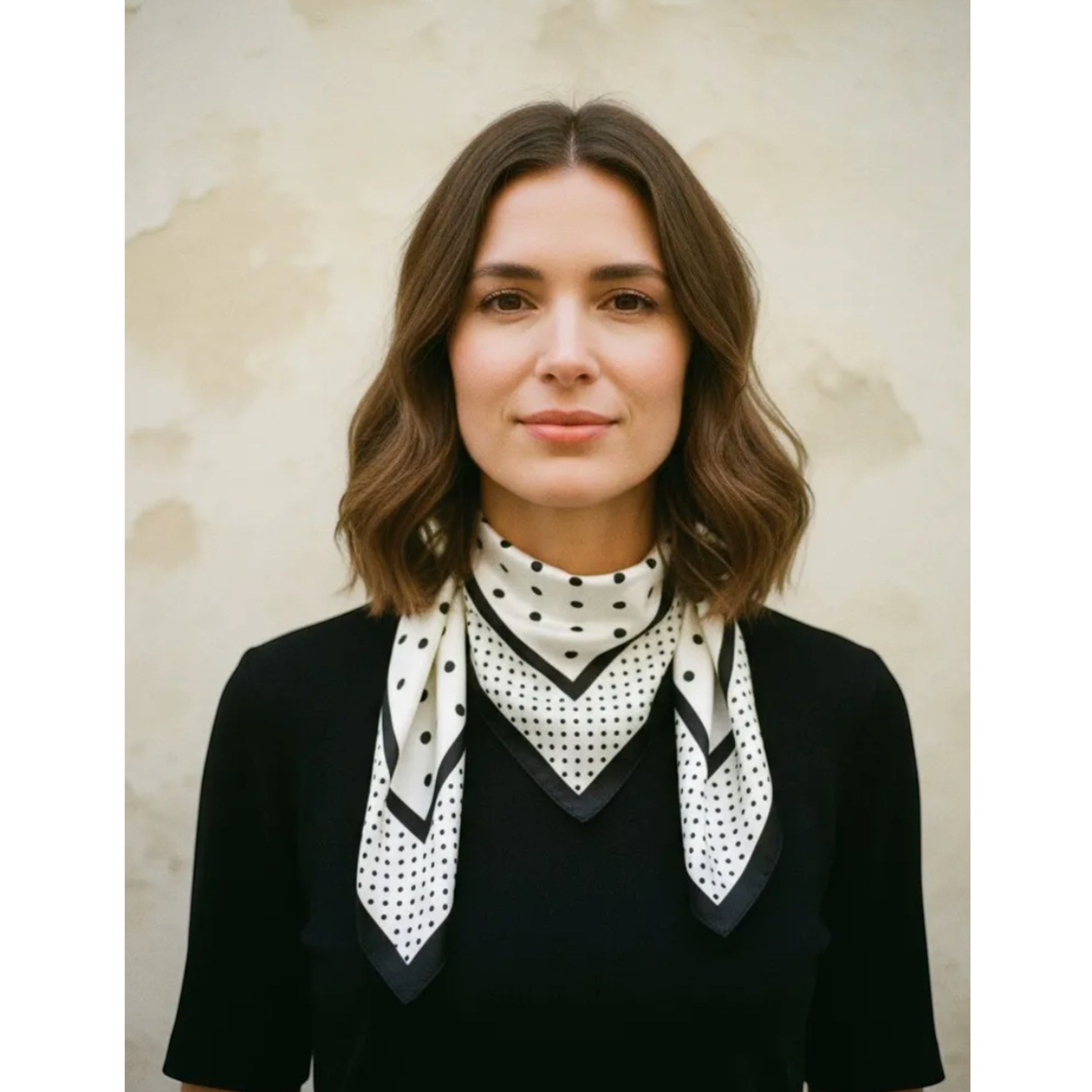 #foulardparisien #foulardpois #stylechic #accessoirefemme #modeparisienne #onykacollection #foulardcarre #scarfstyle #foulardnoirblanc #lookretro