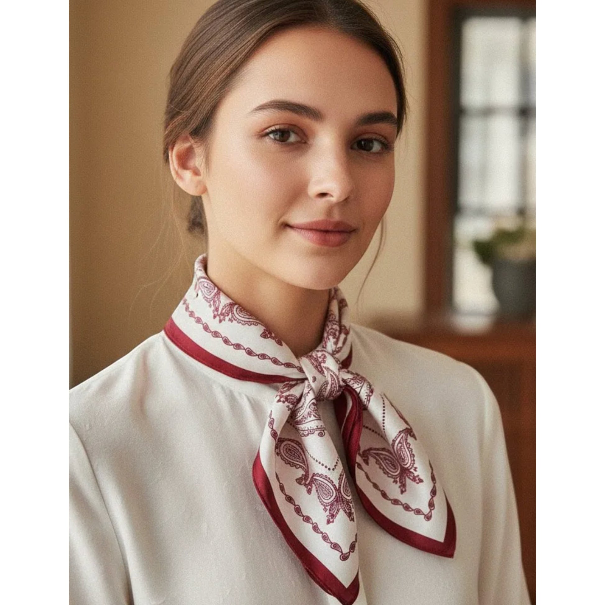 Le foulard Monaco Bordeaux reprend le motif cachemire emblématique du modèle “Monaco Élégance” dans une teinte bordeaux profonde, symbole de féminité et de confiance.